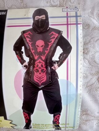 Disfraz de ninja ideal para fiestas de disfraces o eventos temáticos. Es de color negro y rojo, con detalles de llamas y una calavera. Incluye una máscara y cubrebotas. El diseño es llamativo y está en buen estado. Talla única, pantalón de 100 cm de largo y la camisa 70 cm de largo