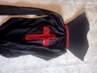 Preciosa túnica negra para niña, ideal para representar a una cruzada medieval. Es una pieza única, perfecta para eventos de disfraces o representaciones teatrales. - Túnica negra con detalles en rojo. - Cruz roja bordada en la parte delantera. - Incluye capa con cuello alto.