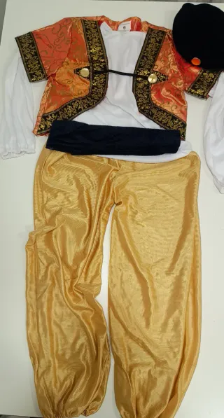 Disfraz de árabe para niño, ideal para fiestas o carnaval. - Incluye turbante, chaleco, camisa, pantalón y cinturón. - Talla 10-12.La cintura tiene goma. Medidas en las fotos. Las babuchas están un poco rotas. Si quieres te las mando también por si las puedes aprovechar