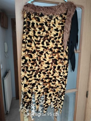 Disfraz de troglodita con estampado de leopardo y detalles de pelo. - Largo aproximado: 95 cm. - Cuello con pelo sintético. - Bajo con rotos y flecos.