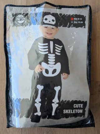 Disfraz de esqueleto para bebé, ideal para Halloween. Incluye mono y gorro. Abrigado, suave. - Talla: 6-12 meses. - Diseño de esqueleto. - Incluye gorro a juego. - El mono es cómodo de poner, con cremallera trasera y velcro en entrepierna. Tiene 2 o 3 usos, se ve algo usado pero está en buen estado.