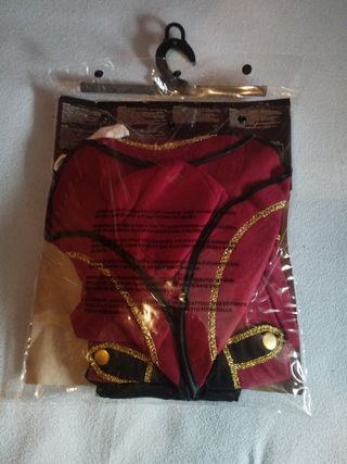 Disfraz niño charlestón talla 5-6 , lleva pantalón, camisa , chaleco y pajarita, está todo perfecto menos el chaleco que le faltan algunas lentejuelas , por eso lo he puesto barato, pero esque es ponérselo nuevo y solo con el roce ya se le cayeron algunas . Aún así no queda mal porque brillan , adjunto foto para que se vea .