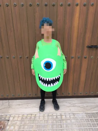 Disfraz del personaje Wazowski de Monstruos S.A. con un tamaño de 60cm. Usado para una actuación. Es de fieltro y forrado en goma Eva. Tengo 2, el otro es de 50 cm. Los tirantes miden 24 cm de largo total desde delante hasta atrás.