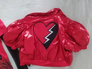 Conjunto de disfraz en color rojo brillante con un diseño llamativo. - Chaqueta con mangas abullonadas. - Corazón roto con rayo negro y blanco en la espalda. - Pantalones negros a juego.