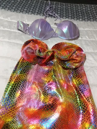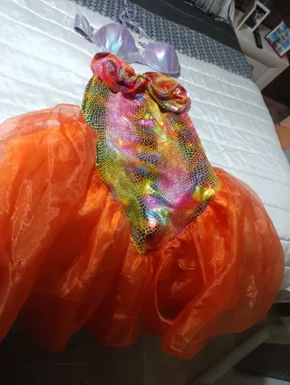 Disfraz de dos piezas con falda naranja y top multicolor. - Falda de tul naranja brillante. - Top con escamas iridiscentes en tonos arcoíris. - Sujetador a juego con acabado nacarado.