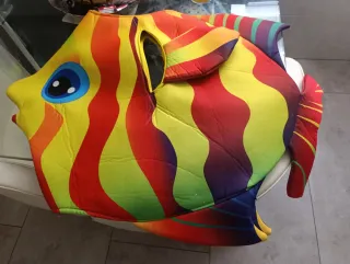 Disfraz divertido con forma de pez. - Diseño con rayas onduladas en colores vivos. - Incluye detalles como ojos y aletas. - Ideal para fiestas o eventos temáticos.