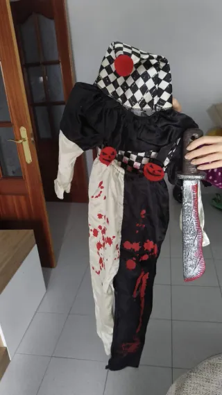 Disfraz de payaso de terror para niños. - Diseño a cuadros y con manchas de sangre. - Incluye gorro de payaso y cuchillo - Talla 3-4 años