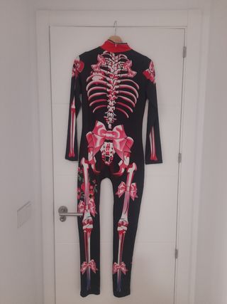 Usado solamente en una ocasión Disfraz de esqueleto para mujer, ideal para fiestas temáticas o Halloween. - Diseño de cuerpo completo con estampado de esqueleto. - Detalles de rosas y calaveras en las piernas. - Cuello alto y mangas largas.