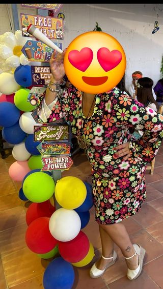 Disfraz con estampado floral vibrante, perfecto para fiestas temáticas. - Diseño de manga larga acampanada. - Cuello en V. - Incluye accesorios como lazo del pelo , pendientes y colgante.