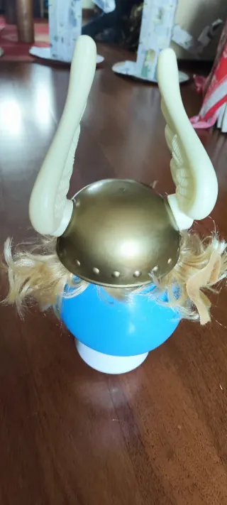 Disfraz de Axteris con casco, peluca, espada y pócima. - Casco dorado con alas. - Peluca rubia. - Espada. - Pócima.