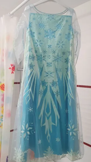 Disfraz Disney de Elsa de Frozen, ideal para fiestas o juegos. - Vestido azul brillante con detalles de copos de nieve. - Mangas transparentes con brillo. - Capa incorporada con diseño de hielo.