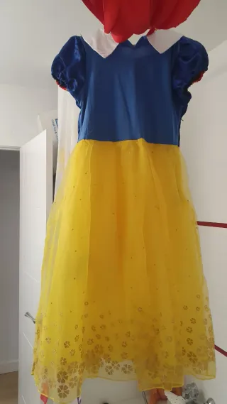Disfraz de Blancanieves para niña, ideal para fiestas o carnaval. - Vestido con corpiño azul y mangas rojas abullonadas. - Falda amarilla brillante. - Detalles dorados en el cuello y el pecho.