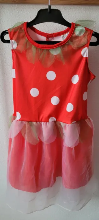Disfraz de fresa de una pieza para niños de 5 a 7 años. - Diseño de fresa con lunares blancos. - Falda con varias capas de tul. - Adornos verdes en el cuello y detalles de corazón. Nunca se ha usado.