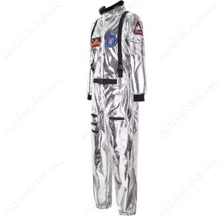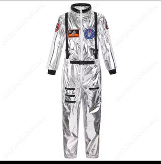 Disfraz de astronauta con un diseño llamativo y brillante. Ideal para fiestas temáticas o eventos. - Diseño plateado. - Cierre frontal con cremallera. - Incluye parches decorativos. - Tirantes ajustables.
