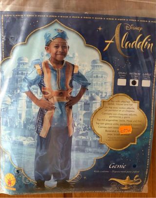 Disfraz de Genio de Aladdin de Disney para niños. Incluye top con chaqueta, pantalón y sombrero. - Talla: M (5-6 años, 104 cm) - Diseño inspirado en el personaje de Aladdin. - Ideal para fiestas de disfraces o Halloween.