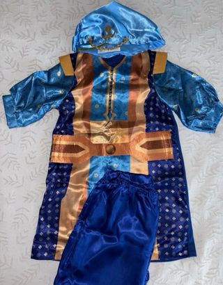 - Disfraz de Adulto en talla única, yo mido 1,80 y soy corpulento y me quedaba genial. Lo vendo con solo 1 puesta, ya está limpio de lavadora. Consta de gorro, camiseta sin mangas, pantalón, bata larga estampada y el cordón rojo y algún adorno que he comprado yo y no venían con el disfraz