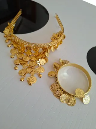 Conjunto de pulsera y diadema con monedas doradas, ideal para disfraces. - Diseño inspirado en el estilo árabe. - Adornos de monedas doradas.