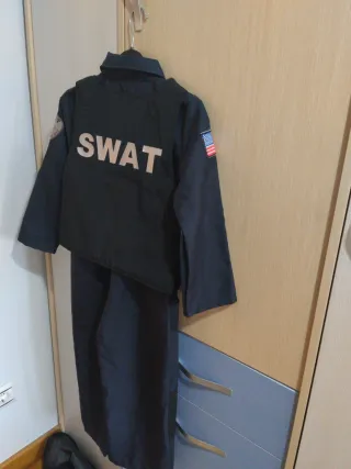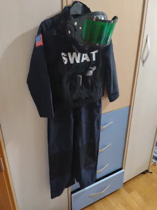 Disfraz de policía SWAT para niños. Incluye chaleco, pantalón y casco. - Chaleco negro con SWAT en blanco. - Bandera de EE.UU. en la manga. - Casco con visera verde. - Accesorio tipo granada.