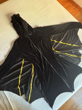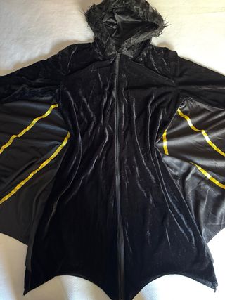 Disfraz de murciélago con un tacto suave y elegante. ideal para fiesta de Halloween. Incluye antifaz. - Confeccionado en terciopelo negro. - Detalles de alas en amarillo. - Diseño con capucha peluda con pequeñas orejas. Usado una sola vez, está nuevo.