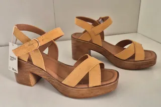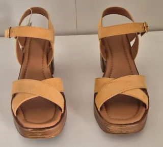 Usadas una vez. Sandalias de cuña con diseño de madera. - Tiras cruzadas en ante. - Hebilla ajustable. - Plataforma de madera.