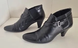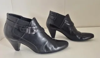 Usados pocas veces, muy bien cuidados. Botines de tacón elegantes y modernos. - Material: Piel. - Cierre con hebilla. - Detalle elástico lateral.