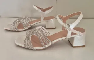 Usados un rato en una boda. Elegantes sandalias de tacón con un diseño adornado con pedrería brillante. Perfectas para ocasiones especiales. - Tacón cuadrado y robusto. - Tiras finas con incrustaciones. - Cierre de pulsera al tobillo.