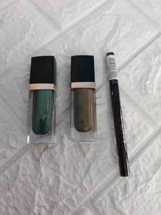 Set de maquillaje para ojos con dos tonos. - Un producto de color verde intenso. - Un producto de color verde oliva. - Un producto delineador