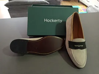 Elegantes zapatos planos de la marca Hockerty. - Diseño en ante beige con detalle frontal en verde. - Acabado interior en piel. - Suela de goma.