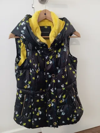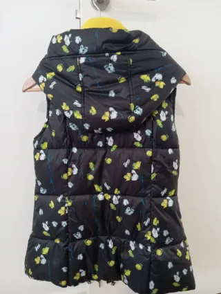 Chaleco de invierno con un estampado floral sobre fondo negro y detalles en amarillo. - Diseño sin mangas. - Cuello alto con forro de pelo. - Cierre de cremallera. - Bolsillos laterales con cremallera.