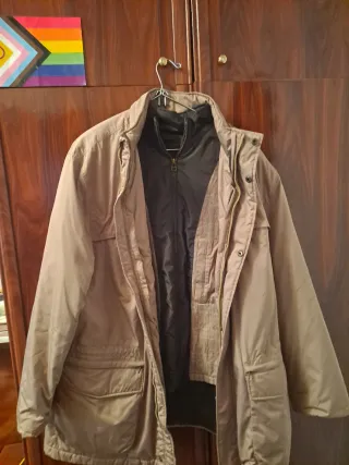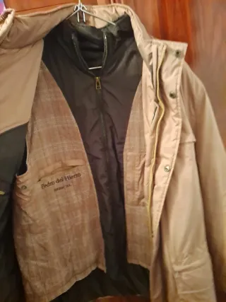 Chaqueta de la marca Pedro del Hierro con un diseño moderno y versátil. - Chaqueta exterior en color beige. - Chaleco interior desmontable en color negro. - Detalle de cuadros en el forro interior del chaleco. - Cierre principal con cremallera.