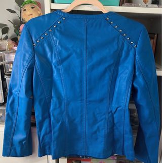 Cazadora tipo Biker en azul con detalles de tachuelas plateadas. Esta sin estrenar. Pone talla L pero es una M. Sus medidas de largo es 56cm, hombros 40cm y pecho 48cm. Material es de viscosa y poliuretano.