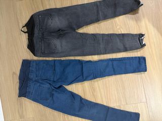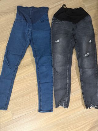 Conjunto de dos pantalones vaqueros diseñados para el embarazo. - Un pantalón es de color azul. - El otro pantalón es de color gris. - Ambos tienen cinturilla elástica para mayor comodidad.