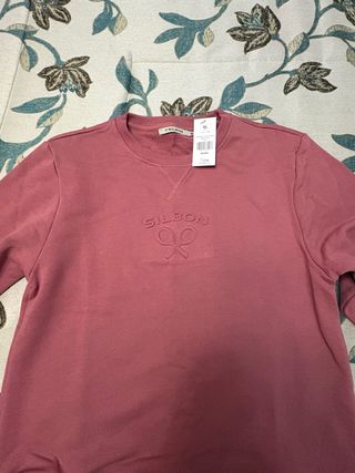 Sudadera de la marca Silbon en color rosa, talla XL. Prenda nueva con etiqueta. - Diseño con logo en relieve en el pecho. - Cuello redondo. - Puños y bajo elásticos.