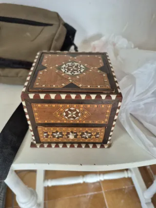 Pequeña caja joyero de madera con incrustaciones. - Diseño geométrico en la tapa. - Dos cajones pequeños. - Detalles de marquetería.