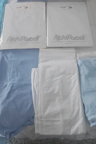 Set de fundas para mesas de masaje. 10 x Fundas blancas,azules y rosa Las fundas para mesas de masaje son TODAS nuevas, 10 en total. Las 5 gordas, aunque son nuevas, se han descolorido por el sol, pero serán excelentes para proteger la mesa de masaje si usa un rollo de papel sobre ella. 10 Euros por el lote