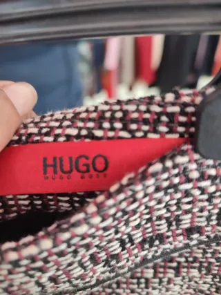 Falda de la marca Hugo Boss con un diseño tejido. - Tejido con hilos negros, rojos y blancos. - Etiqueta roja con logo de Hugo Boss.