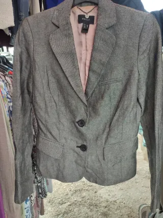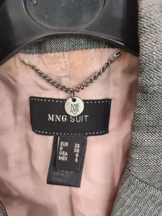 Chaqueta de la marca MNG con un diseño elegante. - Color gris con detalles en rosa. - Talla M (38 EUR, 6 USA, 5 MEX). - Fabricada en Marruecos.