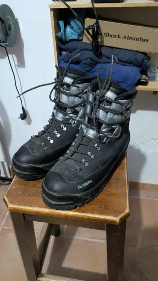 Botas de montaña rígidas Boreal en color negro con detalles plateados. Perfectas para alpinismo y actividades en la montaña. Muy poco uso se puede ver qué no se ha borrado ni el logo de la plantilla en las ultimas fotos Talla 44 , válidas para 43 también son un poco pequeñas - Cierre con cordones. - Diseño robusto. - cramponables
