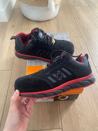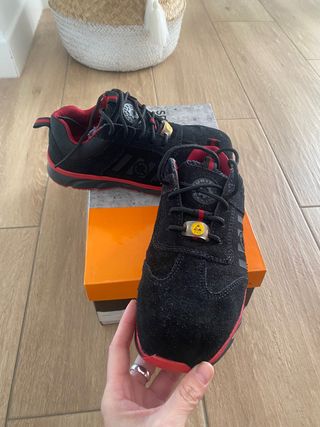 Zapatos de seguridad con un diseño moderno y llamativo. - Exterior de ante negro. - Detalles en color rojo. - Suela de goma antideslizante. - Cierre con cordones. Precio original 60€. Solo usados una vez