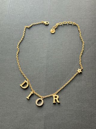 Elegante collar de la marca Dior en tono dorado. Un accesorio que añade un toque de distinción. - Diseño con letras DIOR y un pequeño dije de estrella. - La letra O está adornada con pequeñas incrustaciones brillantes. - Cadena ajustable con cierre de mosquetón.