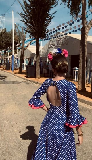 Traje de flamenca talla xxs con un diseño clásico de lunares. Tiene solo dos puestas - Diseño de lunares blancos sobre fondo azul. - Mangas con volantes y detalle rosa. - Espalda descubierta con botones. - Tiene tela para sacarle y podría dar hasta una 34/36. Precio algo negociable