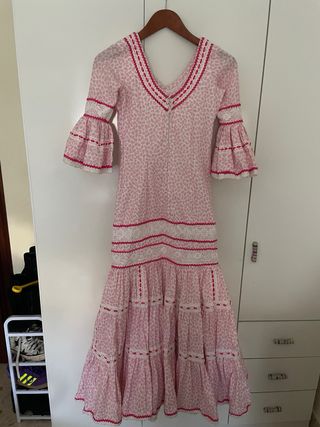 Vestido de flamenca con un diseño alegre y llamativo. - Estampado de lunares blancos sobre fondo rosa. - El mantóncillo no esta incluido - Esta en muy buen estado y queda muy bien, lo vendo por que se me queda pequeño - La marca no es esa pero si no no me deja subir el anuncio