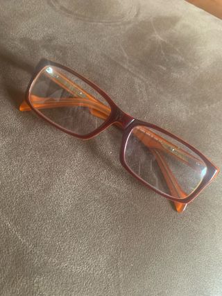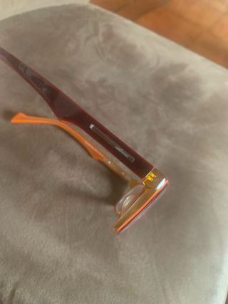 Montura de gafas de ver con un diseño moderno y atractivo. Combina tonos marrones y naranjas para un look distintivo. - Montura de gafas de ver. - Combinación de colores marrón y naranja.