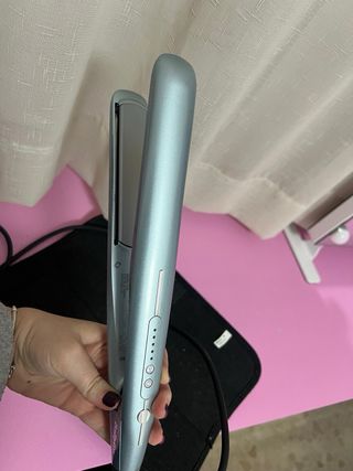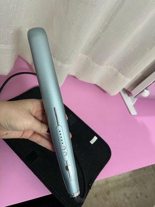 Plancha de pelo en un elegante tono gris verdoso azulado. Cuenta con un diseño moderno y ergonómico. - Indicadores LED de temperatura. - Botones de control intuitivos. - Cable de alimentación giratorio. - Poco uso