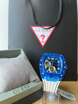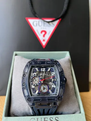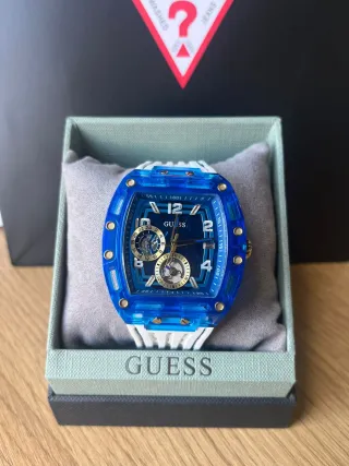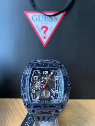 Reloj Guess con un diseño moderno y llamativo. - Caja y correa de material transparente. - Detalles en color azul y plateado en la esfera. - Correa de silicona azul.