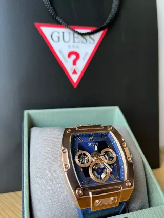 Elegante reloj de la marca Guess con un diseño moderno y llamativo. - Caja y detalles en tono dorado. - Esfera de color azul. - Correa de piel azul.
