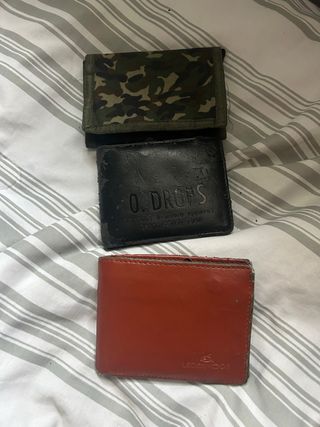 Conjunto de tres carteras para hombre. - Cartera con diseño camuflaje. - Cartera negra con logo O. DROPS. - Cartera naranja de piel con logo LEDERMOOR. Como veis en las fotos estan un poco gastadas pero eso no afecta a nada, lo vendo juntos o separados, separados 5€ cada uno y el lote 10€.