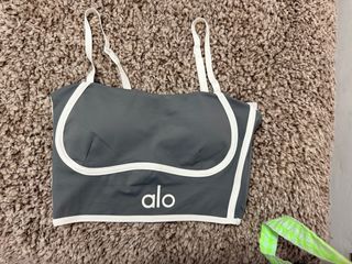 Top deportivo de la marca Alo en color gris. Presenta un diseño moderno con ribetes blancos. - Tirantes finos ajustables. - Detalle de logo 'alo' en la parte frontal. -nose si es original o no fue un regalo de ai el precio -solo lavado -talla s
