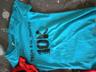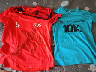 Lote de dos camisetas deportivas, una roja y otra azul, ambas en talla M. - Camiseta roja con diseño gráfico en negro. - Camiseta azul con estampado 10K TECH. - Tejido técnico transpirable.