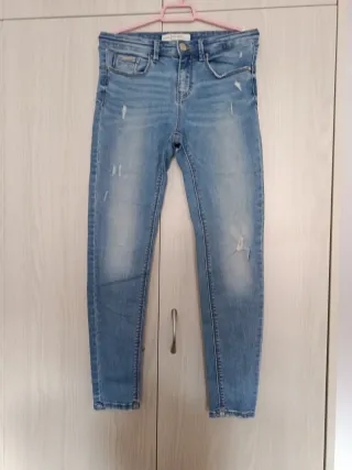 Pantalón vaquero de corte ajustado con un estilo desgastado y moderno. - Diseño con rotos y desgastes. - Tiro medio. - Cierre de cremallera y botón.